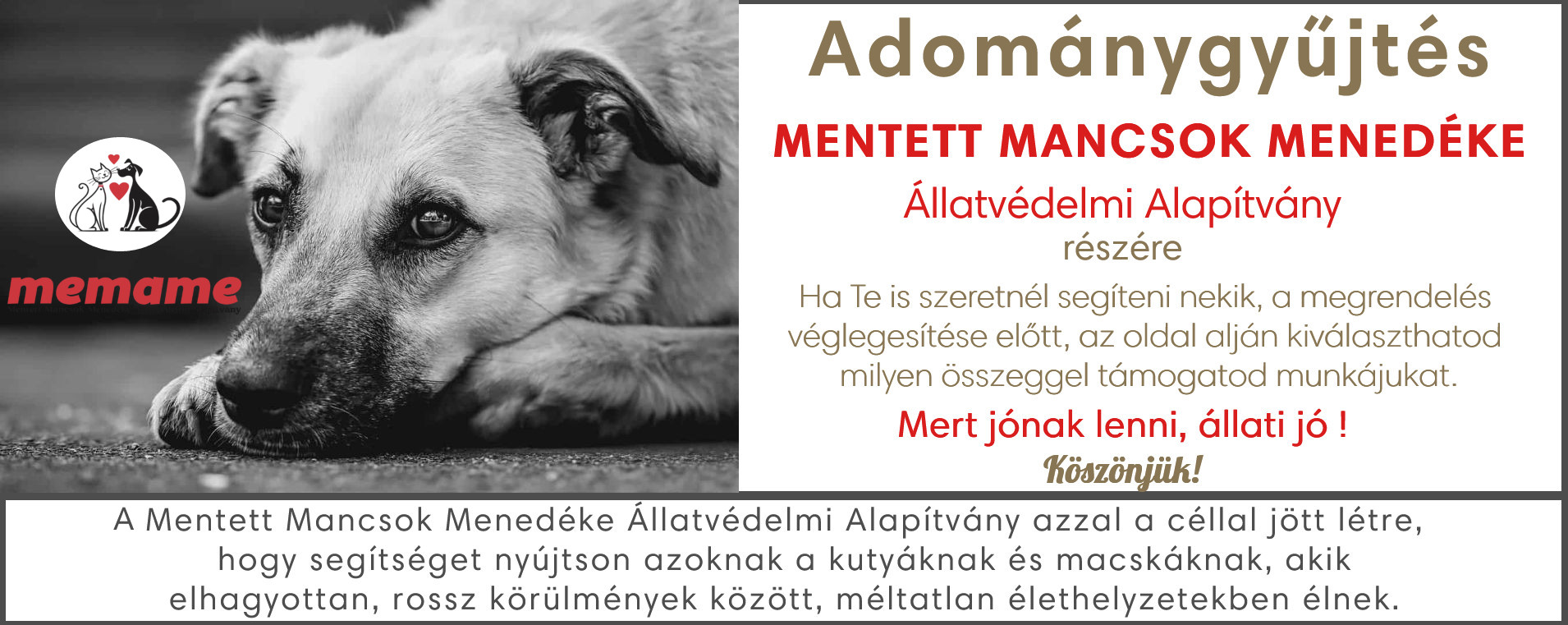 Lehetőséget biztosítunk vásárlóinknak, hogy webáruházunkon keresztül a Mentett Mancsok Menedéke Állatvédelmi Alapítvány-nak adományt és támogatást tudjanak nyújtani.
