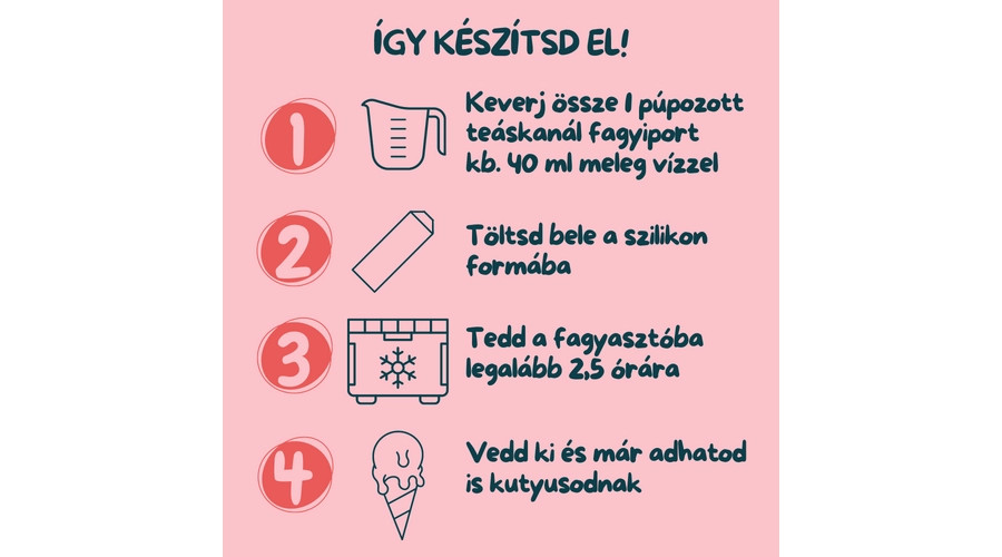 Összesen 10 ízben kapható a magyar gyártású kutyfagyi. A dobozban lévő fagyiporból 10 adag fagyi készíthető el és egy ajándék szilikon fagyiformát is találsz a csomagban.