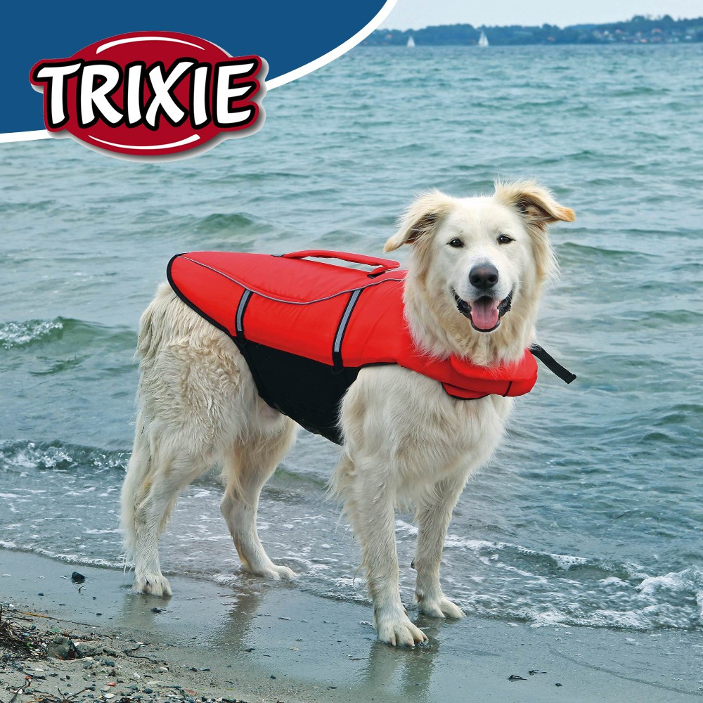 Színe önmagában is feltűnő, ráadásul fényvisszaverő csíkok javítják az észrevehetőséget. A hátán lévő fogantyúval a kutya könnyebben kiemelhető a vízből.