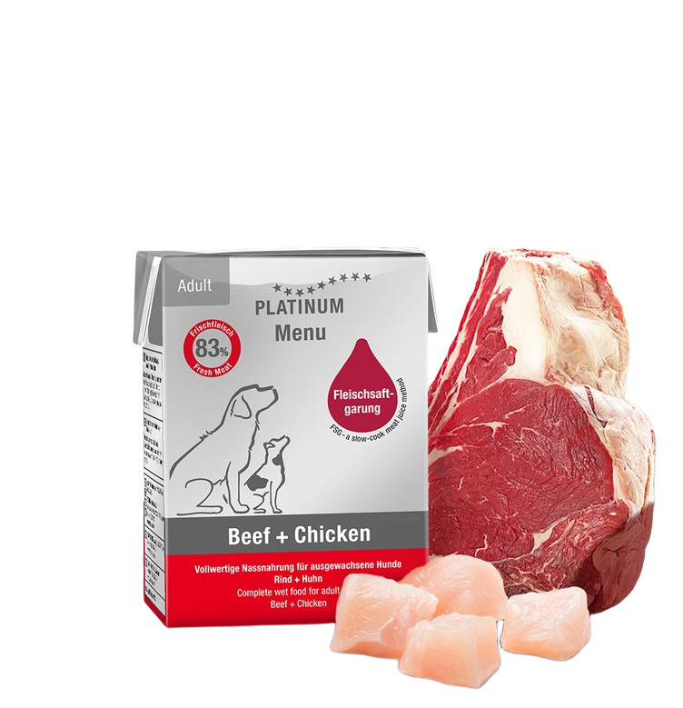 A Platinum MENU Beef + Chicken marha-és csirkehúsból készült, teljes értékű nedves kutyaeledel felnőtt kutyák számára, mely kiváló választás bármilyen fajtájú és méretű kutyának, köszönhetően a természetes és egészséges összetevőknek és a könnyű emészthetőségnek.