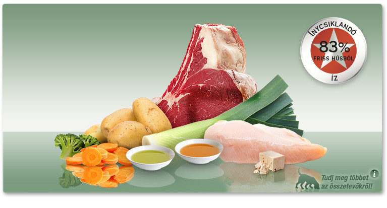 48% friss csirkehús, 35% friss marhahús felhasználásával készül, felesleges adalékanyagok és hozzáadott víz nélkül, kizárólag saját húslevében párolva, kíméletes eljárással készítve.