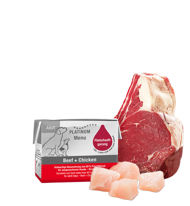 A Platinum MENU Beef + Chicken marha-és csirkehúsból készült, teljes értékű nedves kutyaeledel felnőtt kutyák számára, mely kiváló választás bármilyen fajtájú és méretű kutyának, köszönhetően a természetes és egészséges összetevőknek és a könnyű emészthetőségnek.