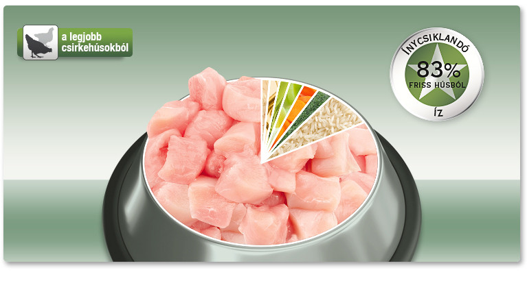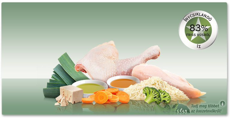 83% friss csirkehúsból készül, kizárólag egész hússzeletekből, felesleges adalékanyagok és hozzáadott víz nélkül, saját húslevében párolva, kíméletes eljárással készítve.