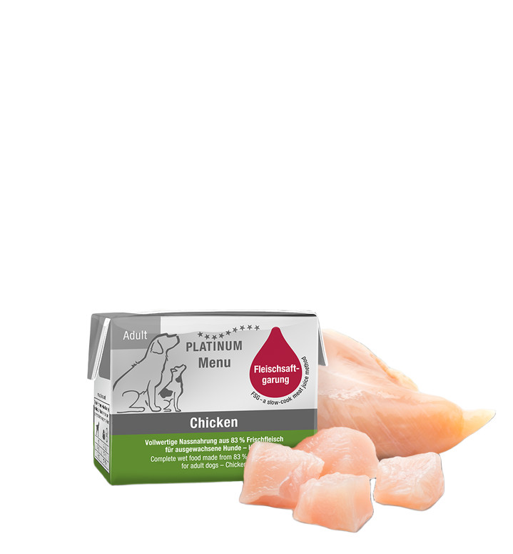 A Platinum MENU Chicken csirkehúsból készült, teljes értékű nedves kutyaeledel felnőtt kutyák számára, mely kiváló választás bármilyen fajtájú és méretű kutyának, köszönhetően a természetes és egészséges összetevőknek és a könnyű emészthetőségnek.