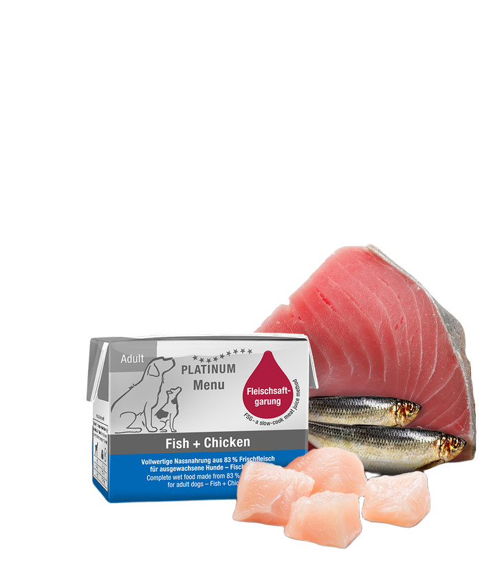 A Platinum MENU Fish + Chicken csirkehúsból és halból készült, teljes értékű nedves kutyaeledel felnőtt kutyák számára, mely kiváló választás bármilyen fajtájú és méretű kutyának, köszönhetően a természetes és egészséges összetevőknek és a könnyű emészthetőségnek.