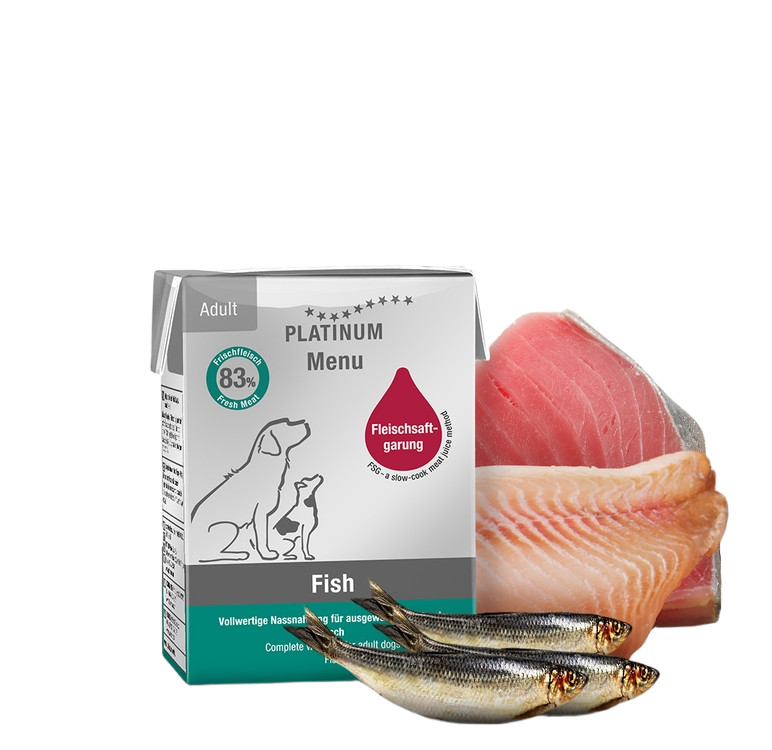 A Platinum MENU Fish halból készült, teljes értékű nedves kutyaeledel felnőtt kutyák számára, mely kiváló választás bármilyen fajtájú és méretű kutyának, köszönhetően a természetes és egészséges összetevőknek és a könnyű emészthetőségnek.