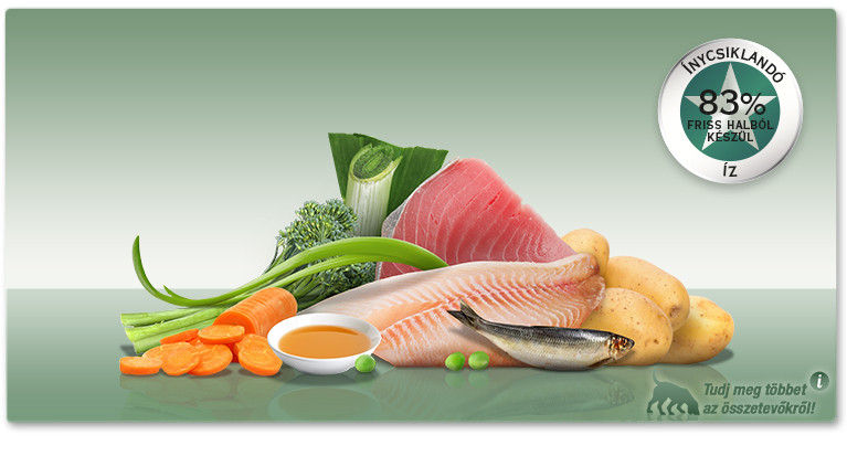 Friss szardínia (40%), friss tonhal (25%), friss pisztráng (18%), napraforgóolaj, szárított burgonya, szárított zöldségek (brokkoli, sárgarépa, póréhagyma), olívaolaj