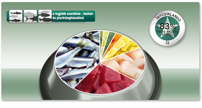 Friss szardínia (40%), friss tonhal (25%), friss pisztráng (18%), napraforgóolaj, szárított burgonya, szárított zöldségek (brokkoli, sárgarépa, póréhagyma), olívaolaj