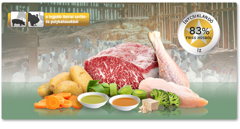 42% friss pulykahús, 35% friss ibériai sertéshús, 6% friss csirkehús felhasználásával készül, felesleges adalékanyagok és hozzáadott víz nélkül, kizárólag saját húslevében párolva, kíméletes eljárással készítve.