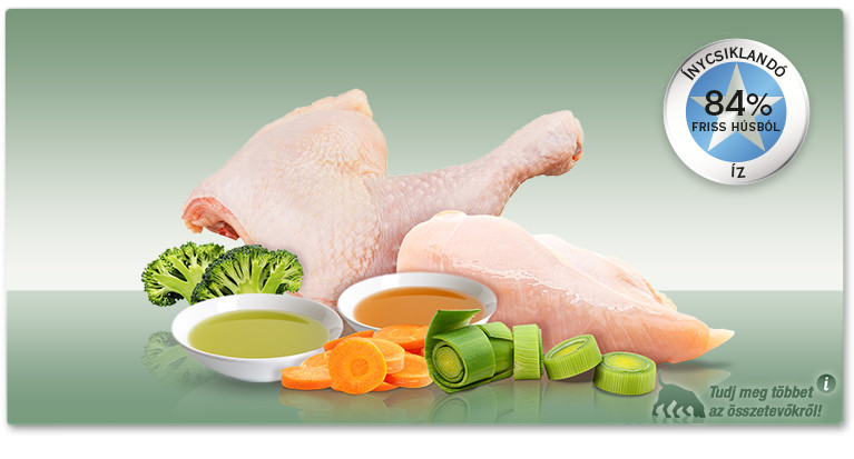 84% friss csirkehúsból készül, egész hússzeletekből, felesleges adalékanyagok és hozzáadott víz nélkül, kizárólag saját húslevében párolva, kíméletes eljárással készítve. A friss hús mellé kizárólag a legkiválóbb minőségű alapanyagok kerülnek, melyek egytől egyig a kölyökkutya egészséges fejlődéséről gondoskodnak.